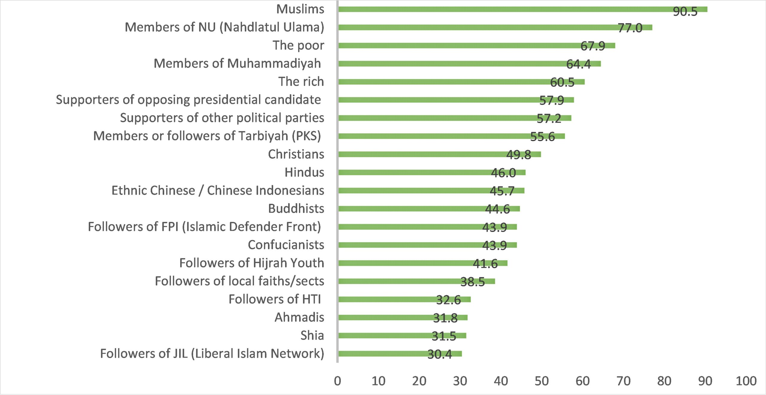 So, if PKS drew mildly warm “feelings”, which groups evinced the coolest responses? The five lowest-ranked groups were: local faith sects (38 degrees), usually a reference to heterodox Muslims groups (sometimes referred to Kepercayaan or Kebatinan); the banned Islamist movement Hizbut Tahrir Indonesia (33); the Muslim minority sects Ahmadiyah and the Shia (both 32); and, at the very bottom, the progressive Liberal Islamic Network (JIL) (30), which has been inactive for many years.