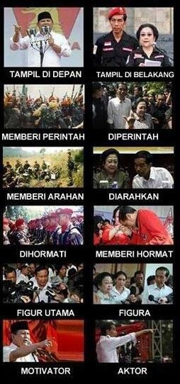This image passed around social media is an example of what appears to be one of the most common – and effective – criticisms of Jokowi. The images and accompanying captions contrast Prabowo’s supposed strong leadership and autonomy (on the left) with Jokowi’s perceived lack of assertiveness and apparent domination by Megawati (on the right).