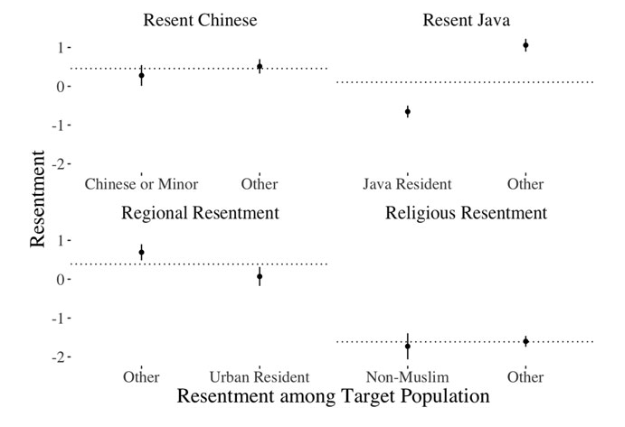 Our results show that across every area of resentment, our easily-coded “in-groups”—such as Java residents, residents of district capitals, and Muslims—show higher levels of resentment than members of corresponding “out-groups”: those living off Java, residents of rural districts, and non-Muslims. (While we lack a specific measure of Chinese Indonesians, we can estimate that this holds for Chinese-Indonesians too).