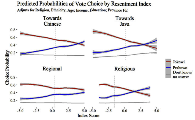 What does this mean for electoral politics? We find that each of the four resentments has predictive power for political affiliation, though magnitude of the relationship differs. To operationalise the relationship between resentment and political preferences, we look at the relationship between resentment scores and support for the presidential candidate Prabowo Subianto. We focus on support for Prabowo because his campaign most actively mobilised religious and anti-Chinese resentment.
