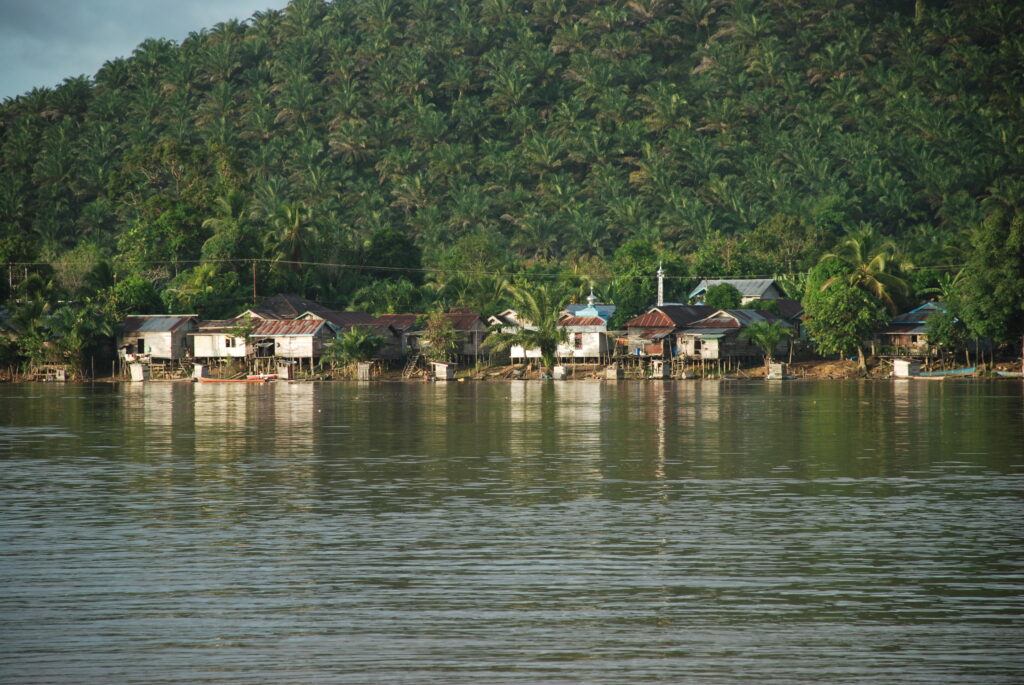 An oil palm plantation next to a hamlet in West Kalimantan. Violating several laws and regulations, plantations often reach the edge of rivers and encircle hamlets which are left with no farmland at all (Photo: Pujo Semedi)