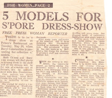 Reporting on Beryl’s first ‘fashion show’ in Singapore (article provide by Geoff Constantine from family records, date and source not apparent)