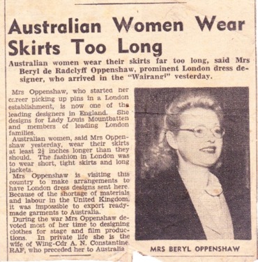 Beryl’s ‘outspoken’ comments on Australian womens’ skirts were reported in the media (article provide by Geoff Constantine from family records, date and source not apparent)