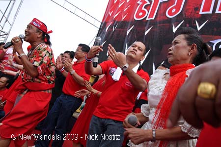 Red Shirt leader Nattawut Saikua joins a famous traditional music group on the Red Shirt stage. 17/8/2009, ┬й2009, Nick Nostitz/Agentur Focus