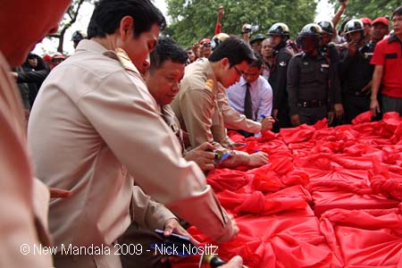 Asia, Thailand, Bangkok, Red Shirt protests, 30 000 to 40 000 Red Shirts gathered at Sanam Luang to submit a petition to the King to pardon exiled former Prime Minister Thaksin Shinawatra. In an elaborate procession the marched to the nearby Grand Palace, and delivered 383 boxes with estimated 5 million signatures. Palace officials stamp and sign the boxes with the signatures. 17/8/2009, ┬й2009, Nick Nostitz/Agentur Focus