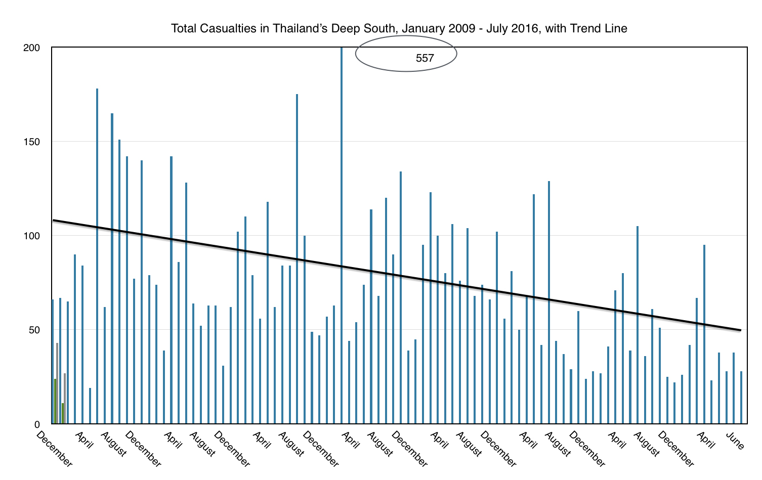 Violence in 2016 is clearly down, as it was in 2015. The average monthly death toll is currently just under 13, a third of what it was in 2009. Since the start of 2009, the monthly average number of casualties in the south has been 81. But since the May 2014 coup, it has fallen to 49.