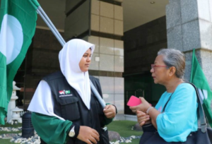 Author interviewing PAS woman campaigner during Malaysia’s 14th general election