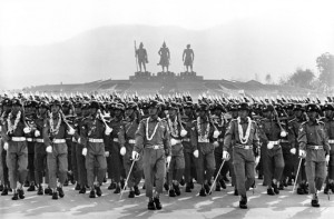 The Burma army on Armed Forces Day. This vast military parade is an annual event that commemorates the birth of the modren Burmese army in 1945. Here some 15,000 troops marched in a vast parade ground beneath the statues of long dead Burmese kings. Burma has one of the largest standing armies in South East Asia with almost half a million men under arms. Nay Pyi Daw March 2007.