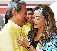 Eat more longan, please. Actress Naowarat Yuktanant pins a campaign badge on the chest of Prime Minister Surayud Chulanont at Government House yesterday. On behalf of the Agricultural Extension Department, she is promoting the consumption of longan for its anti-free radical, anti-ageing and anti-impotence properties. Growers of the fruit are suffering from a price slump.