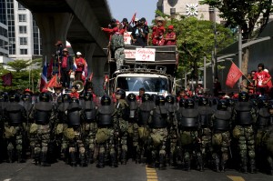 “Red Shirt” protesters are met by soliders in riot gear in Ploenchit one of Bangkok’s busy business areas in the city centre.