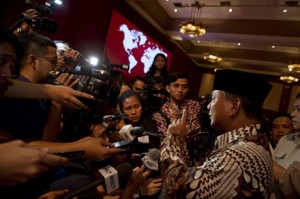 Indonesian presidential candidate Prabowo Subianto (R) speaks with journalists after delivering a speech before the Indonesian Council of World Affairs in Jakarta on June 30, 2014. The Democratic Party, Indonesia’s ruling party on June 30, 2014 threw its support behind presidential candidate Prabowo Subianto ahead of elections next week, a further boost for the ex-general and a blow to frontrunner Joko Widodo. AFP PHOTO / ROMEO GACAD