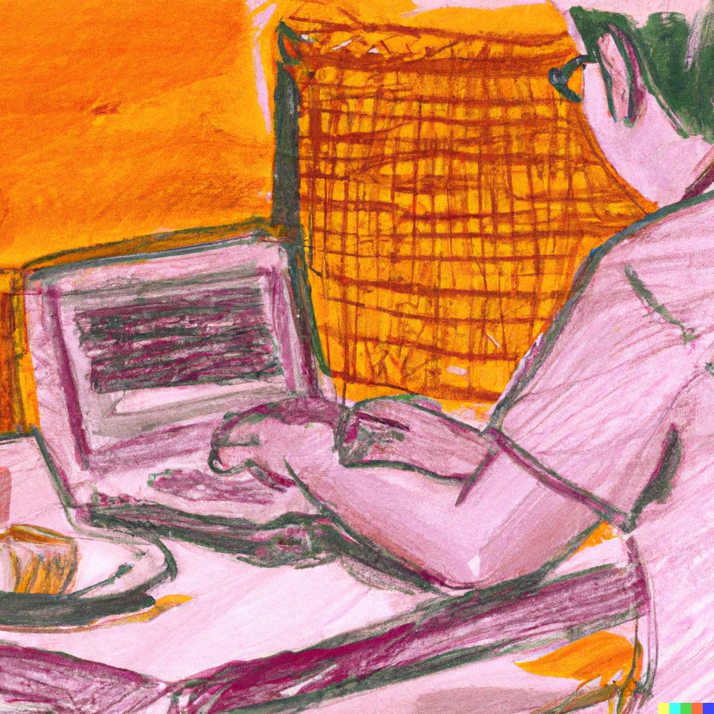 DALL·E 2024-08-15 17.30.54 – a pastel sketch of someone typing on a laptop at a yangon teashop table