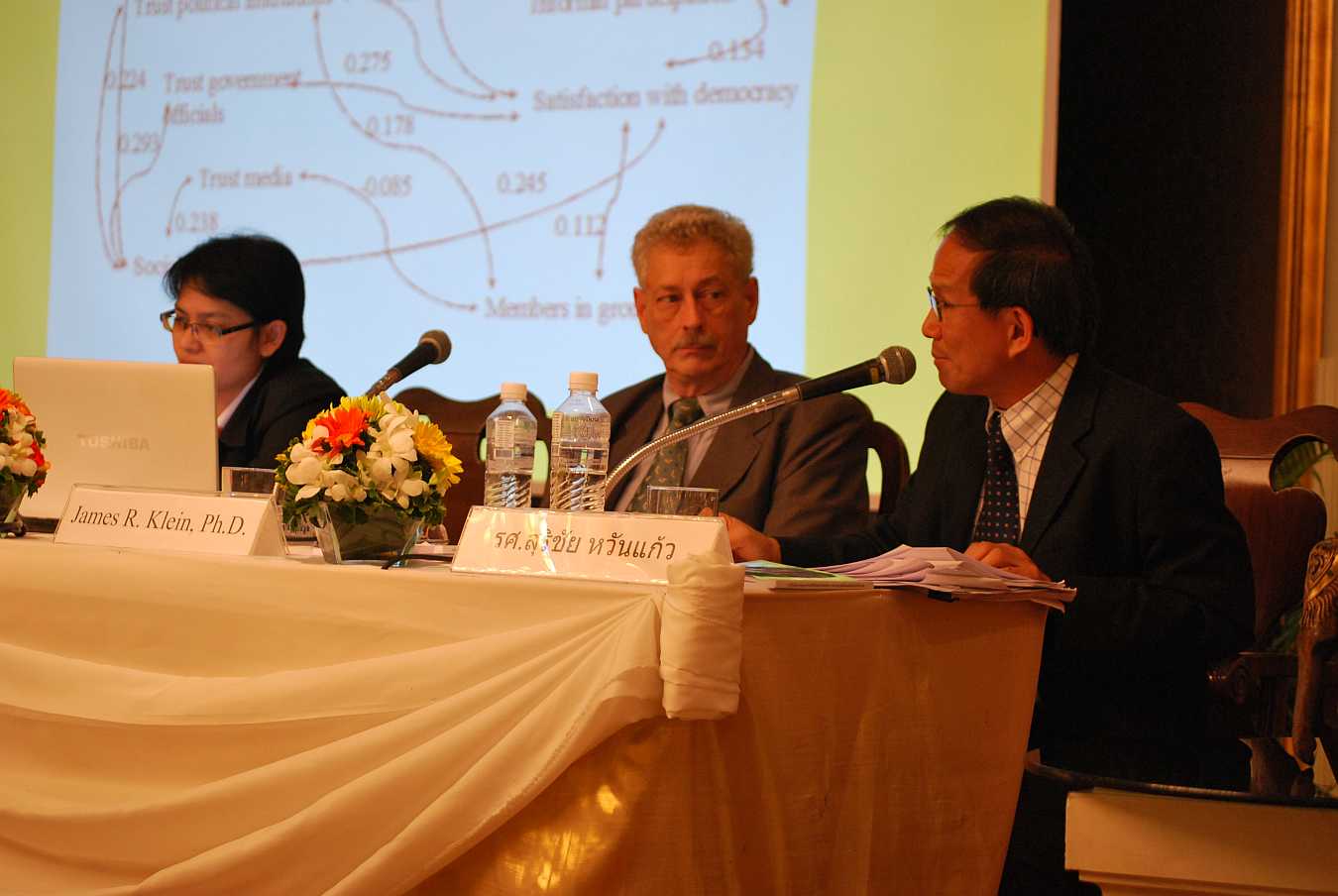 Yesterday, well known advocate for democratic values in Thailand, James Klein, launched the Asia Foundation’s study on Constitutional Reform and Democracy in Thailand: A National Survey of the Thai People. The report is here. A press release is here. A summary of main findings is here. And here is a photo of the launch, with a nice image of the Thai political process in the background (click for a larger version).