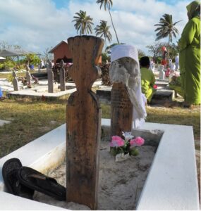 Figure 3. A woman’s grave adorned with sandals and flowers.