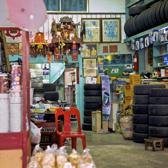 The city as a living space, and that with its related concept of urbanism as a social phenomenon that according to Louis Wirth describes the rationalised lifestyle of urban people in comparison to the provinciality of rural inhabitants, is among the great themes of contemporary photography. Barely uttered, the “magic word” creates in our minds large pictures in which develop the technological aesthetic of urban-building excesses in globalised mega-cities. What we often forget in this respect is a second dimension of urbanism, which embraces the coexistence of various types of people, each with their own identity, in a limited living space. With his SHOPHOUSES – 4 x 8 m Bangkok series of works, Nitsch focuses precisely on this dimension. Beyond the skyscrapers and neon signs, which also increasingly oust the traditional cityscape of Bangkok, the photographer-artist, who was born in Germany in 1973, grants us an intimate view of the retail businesses that are typical of Southeast Asia and the lives of their owners. For many of them the mostly two-storey shop, that on the lower level is open to the street, is workplace and living space in one. Thus Nitsch’s photographs condense entire lifestyles in cramped surrounding that are often crammed full to the last centimetre and nevertheless radiate an almost meditative peace. …