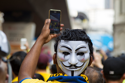 Selfies and Guy Fawkes masks featured at Bersih 4. Photo: Getty Images.