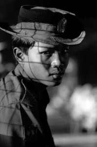 A young Burmese soldier awaits his unit at a train station in Kachin State. Many young boys are forced to join the Burmese army, some as young as 11. Some are kidnapped from the streets of cities like Rangoon. Others join thinking that they can escape poverty and provide for their families. They are often sent straight to ethnic areas to fight insurgents with rudimentary training. All of the various armies fighting the Burma army have child soldiers. The insurgents argue that they are fighting for their survival and need all able males to defend their homes. The Burmese army reportedly has the highest number of child soldiers of any army in the world. 1998.