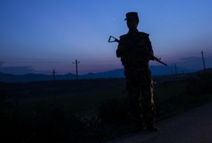 An armed Chinese border defense soldier stands guard as he patrols along the 214 National Highway near the border of China and Myanmar in Mengyang town, Jinghong city, Xishuangbanna Dai Autonomous Prefecture, southwest Chinas Yunnan province, 17 June 2013.