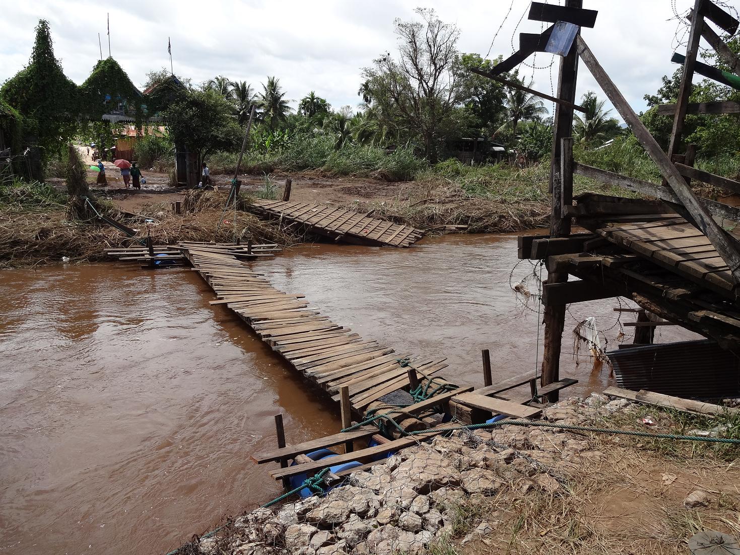 Further southwards along the Moei, severe damage was wreaked in the areas around Ban Waley, in Tak’s Phop Phra Distict, about 40 km south of Mae Sot, near the beginning of the Moei River, and at Ban Mae Khon Kaen, in Tambon Mahawan, about 16 km south of Mae Sot township, opposite Phalu. At Ban Waley, the wooden foot-bridge used by local villagers to cross between the Thai and Burmese sides was washed away. On the Burmese side, only the portal with the DKBA flag and a photo of U Thuzana, the spiritual leader of the DKBA, was left standing. A temporary walk-way was emplaced by 5 August.