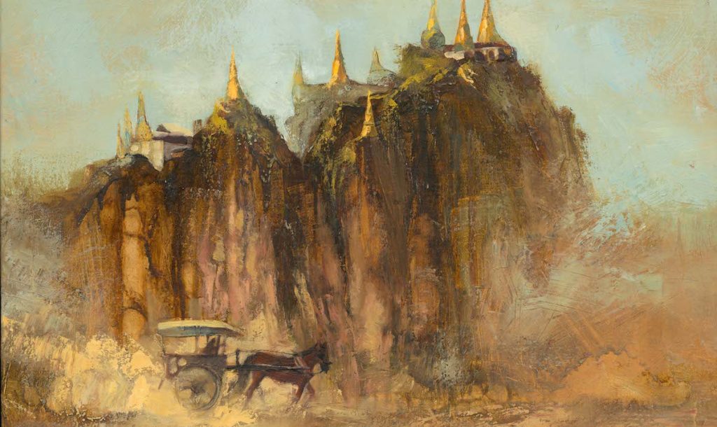 One of his paintings stands out in my mind as a good example of Sun Myint’s approach to art at the time. It was titled “The Pilgrims” and depicted a horse-drawn cart, beneath a steep escarpment on which there were several golden and white pagodas [see image above the title of this article]. The scene was finely drawn, with a wonderful use of colour, but what I liked most about it was the creative use of blank space, almost like a traditional Chinese ink painting. This gave the work a wonderful ethereal, other-worldly feel.