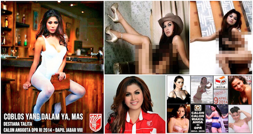 The 2014 parliamentary elections will see dangdut performer Camellia Panduwinata Lubis (stage name Camel Petir) standing for the Indonesian Justice and Unity Party (PKPI), in a Jakarta electorate in which Indonesia’s overseas diaspora makes up half the constituency. Destiya Purna Panca (better known as Destiara Talita) is also running on a PKPI ticket. A men’s magazine model, Destiara’s inclusion on the Electoral Commission’s fixed candidate roll has not deterred her from uploading saucy ‘selfies’ to her Twitter account. Online satirists have been quick to circulate several of Destiara’s glamour shots, edited to include her party’s logo alongside provocative mock slogans.