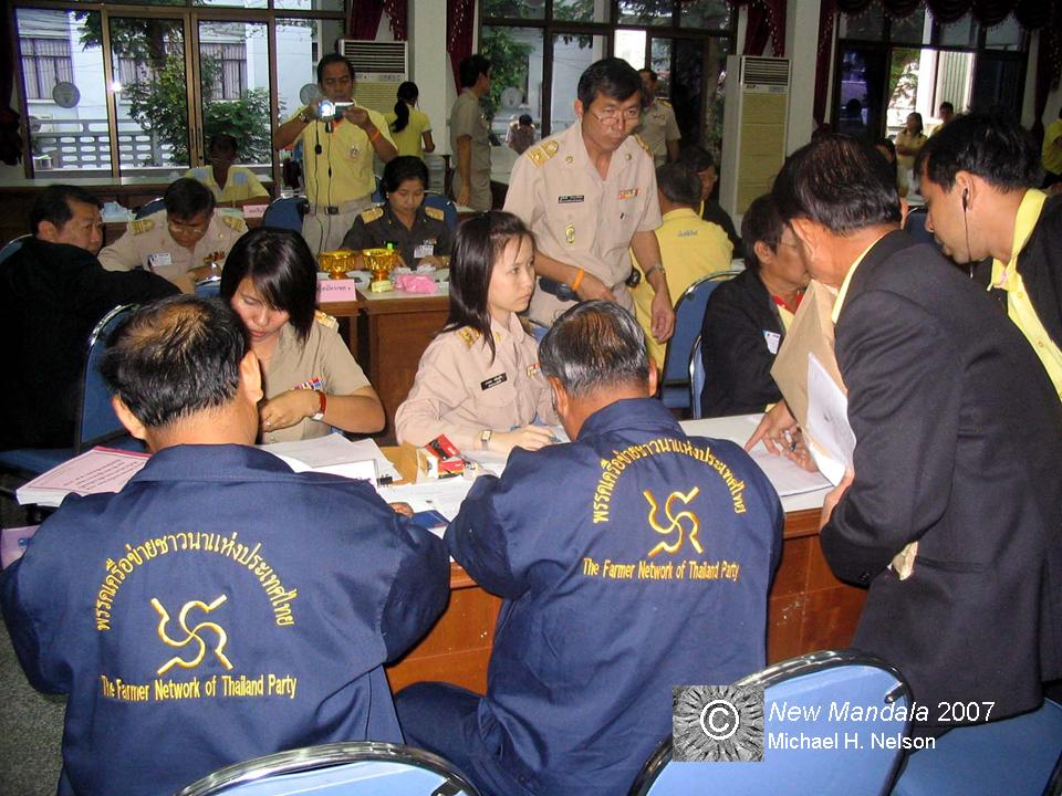 Country-wide, the registration of provincial constituency candidates for the election on 23 December, 2007, takes place from November 12 to 16. After the 2007 Constitution returned from the single-member constituency system introduced by the 1997 Constitution to the previous multi-member constituency system, Chachoengsao is divided into two constituencies with two members of parliament each. The electoral administration is in the hands of the office of the provincial election commission (PEC), the two constituency committees, and district-level sub-committees. As had been the case with the constitution referendum, I have moved to Chachoengsao to observe the election as part of a project covering 14 provinces conducted by King Prajadhipok’s Institute (KPI).