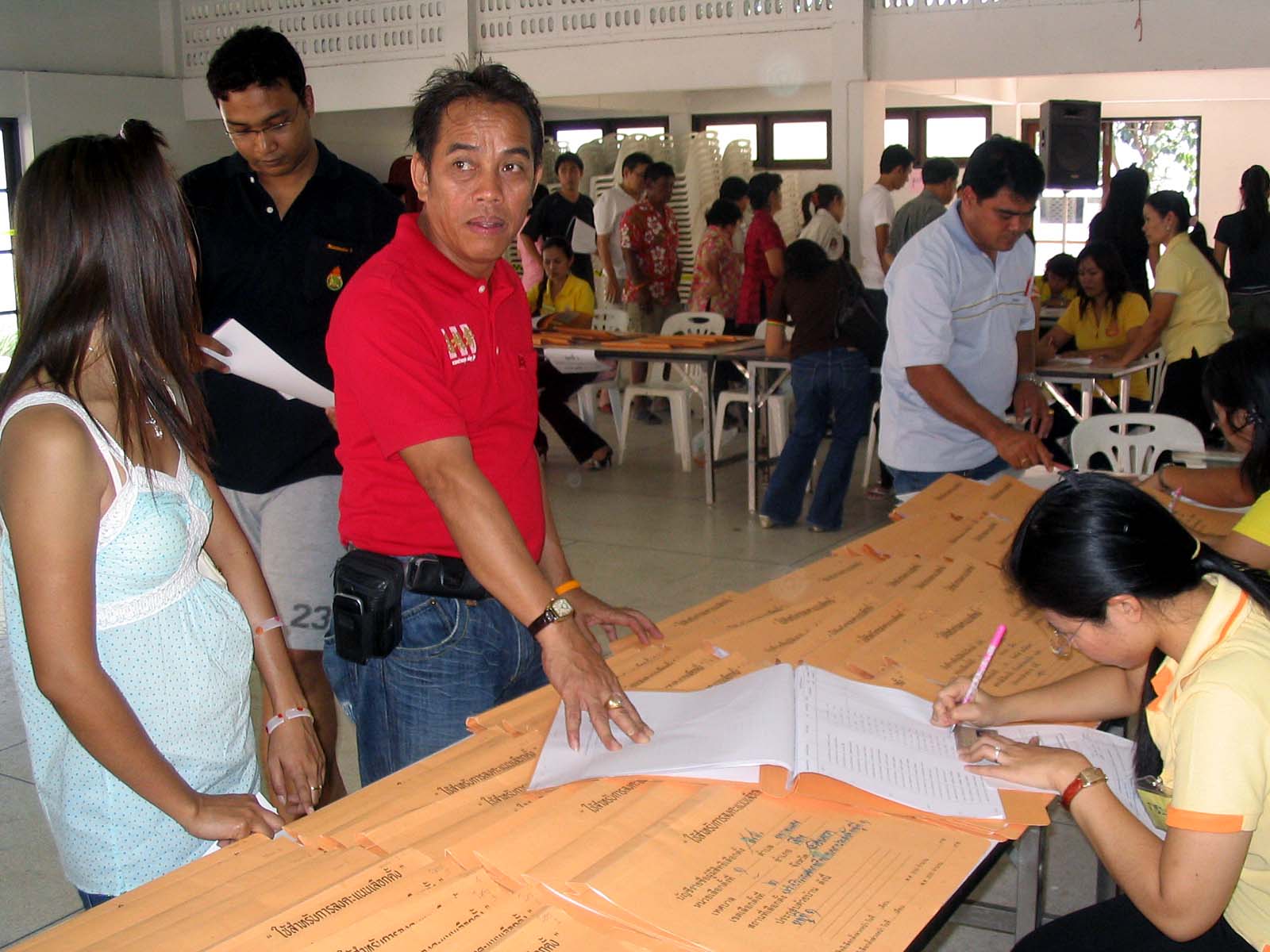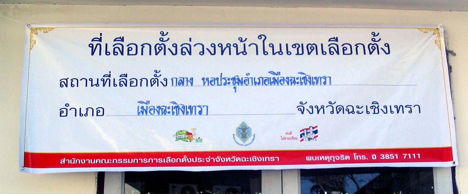Every province had one central polling station for this purpose. Picture 1 shows a banner saying that this was the central polling station for nok khet changwat (outside of the province). In the election of February 2005, sala thai, the open multi-purpose hall opposite the provincial hall, was sufficient to do the job of advance voting for all provinces outside of Chachoengsao. At that time, only 348,739 people had registered countrywide, and only 143,153 (41.1%) of them actually voted. This year, the figure had jumped to 2,095,410, of who 1,838,889 (87.75%) came to cast their ballots. In Chachoengsao, 24,838 voters had registered, of whom 20,612 (82%) turned up in equal numbers on both days.