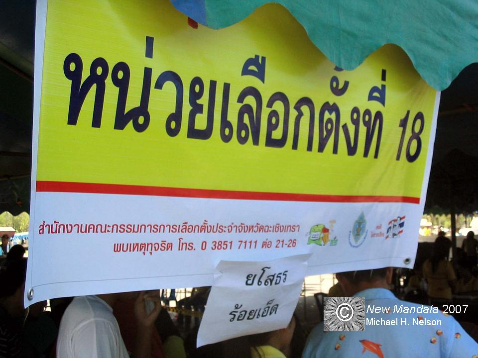 Her voting behavior was interesting since she split her vote, choosing the Democrats on the party-list system and Chart Thai for the two seats in her constituency back in Ubon Ratchathani. She said that she had voted for the party that she liked, especially for Abhisit Vejjajiva, based on the “khomun” (data) that she had gained through her daily reading of the newspapers. In addition, she disliked TRT, and Samak being the nominee of Thaksin. She added, however, that many of her friends from the Northeast, even the one who accompanied her to the polling station, still liked Thaksin and thus voted for the People’s Power Party (PPP). Regarding the constituency vote, she pointed to the fact that she has been living in Chachoengsao for so many years already that she had no idea whom to vote for. Therefore, she had called her mother in Ubon. She gave her the advice to vote for the Chart Thai candidates, because they had done many good things for the area where the family lived, and they had always been helpful when help was needed. Since this young women had no better idea of who to vote for in her home constituency, she followed her mom’s suggestion.