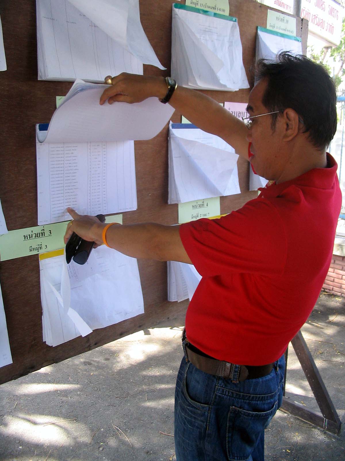 In picture 9, our voter points to his name on the voter roll of his original polling station. If I remember correctly, his rank number was 701-normally, a polling area should encompass between 700 and 800 eligible voters. Otherwise, if there is a high turnout, polling stations might get into trouble processing the voters, because they are open only from 08.00 hours to 15.00 hours. In the 2005 election, I had observed one polling station in Bang Nam Prioew district, which had a long queue of voters right from the opening of the station until its closure. Thus, the chairperson decided to let all those voters use their rights who had turned up until 15.00 hours. In fact, that was not permissible.