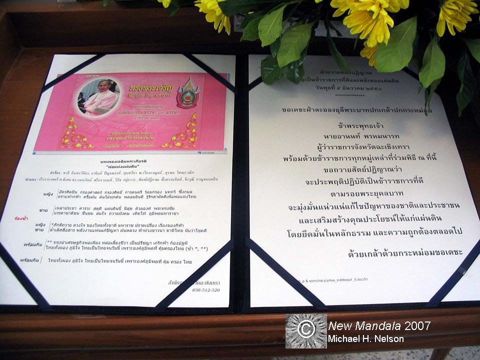 After the governor had lit the candles of the Buddhist shrine, with ten monks sitting on the podium to the right, a brief prayer was spoken, followed by the governor performing a short ceremony at the shrine in front of the King’s picture. This included the removal of the banana-leafed cup from a tray with flowers, and the placing on the shrine of one silver-colored (right-hand side) and gold-colored (left-hand side) lotus-bud shaped (artificial) flower offering on trays. Afterwards, he addressed the King. In fact, of course, the governor is by far too lowly a person that he could dare address the King on a person-to-person basis. Rather, he had to use a phrase beloved by more egalitarian-minded democrats, namely “kho decha fa laongthuli phrabat pokklao pokkramom.”