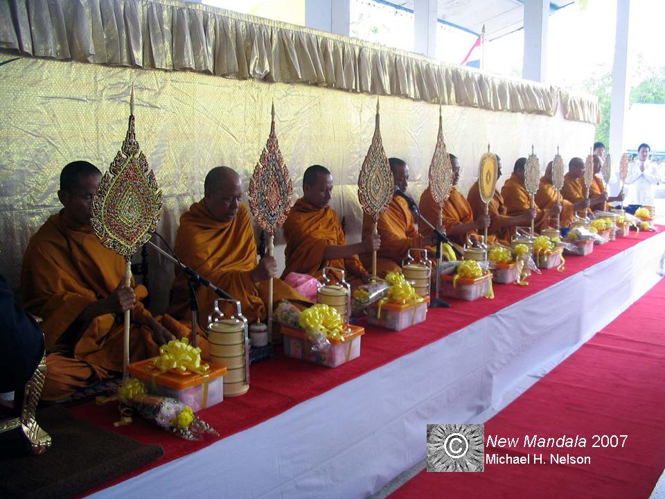 The Buddhist merit making concluded after the governor and other officials had offered food to the monks. While the monks were chanting (picture 8), and the rest of the audience put the palms of their hands together in prayer, the governor performed the act of kruat nam by slowly pouring water from a small bottle into a bowl sitting on a tray. This act is necessary to make the merit-making ceremony complete.