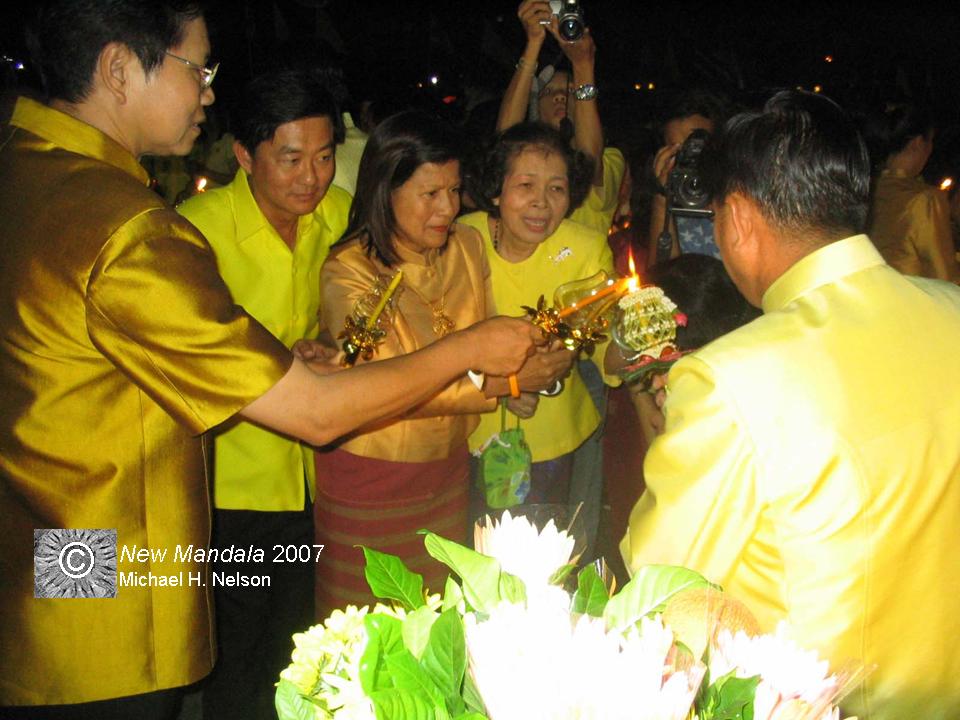 On December 5, 2007, something more important than electoral politics occupied public and official spaces as well as the thoughts and feelings of a great number of Thais-the King’s 80th birthday anniversary. By default, this event also provided yet another occasion to reproduce the conservative trinity of “Nation, Religion, Monarchy.” If anything, this theme was made more important by the King’s birthday speech one day earlier, in which he had warned that without unity (samakkhi) the country might plunge “into disaster” (Bangkok Post, Dec. 5, 2007). He reiterated this in his brief address to well-wishers from the balcony of the Grand Palace. The Bangkok Post (Dec. 6, 2007) wrote, “It was the third time this week the King has spoken of unity. In a speech given to soldiers taking part in Trooping the Colours on Sunday the King called for unity among the armed forces and all Thais, saying that the situation was unstable. He urged them to put national security above all else.”