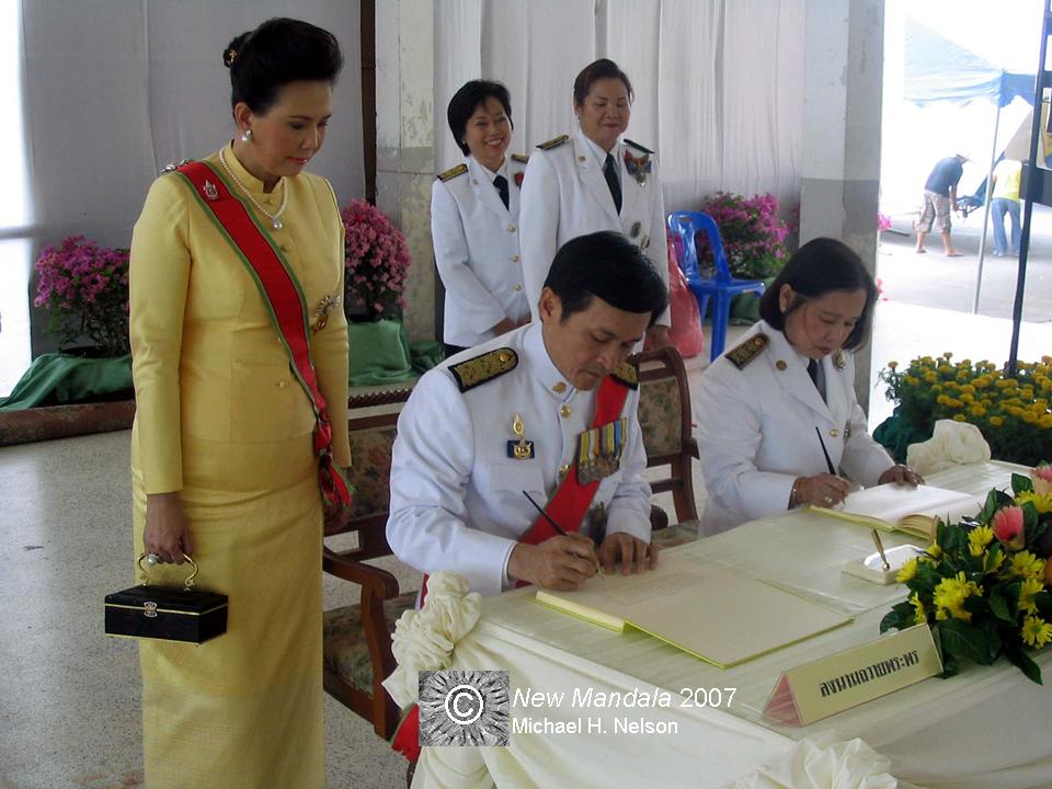 After this merit making ceremony, the proceedings moved to inside sala thai, which is an open multi-purpose hall. It will also be used for advance voting on December 15-16 for those voters who do not want to return to their provinces for the election. For some time before the official ceremony started, a table with two chairs and two albums was placed opposite a huge picture of the King so that mainly civil servants wearing white uniforms could write down their best birthday wishes to the King. All the while, groups of civil servants had pictures taken in front of the picture of the King. The official part started when the provincial governor arrived to perform this same act. Picture 3 shows him observing his wife adding her best wishes.