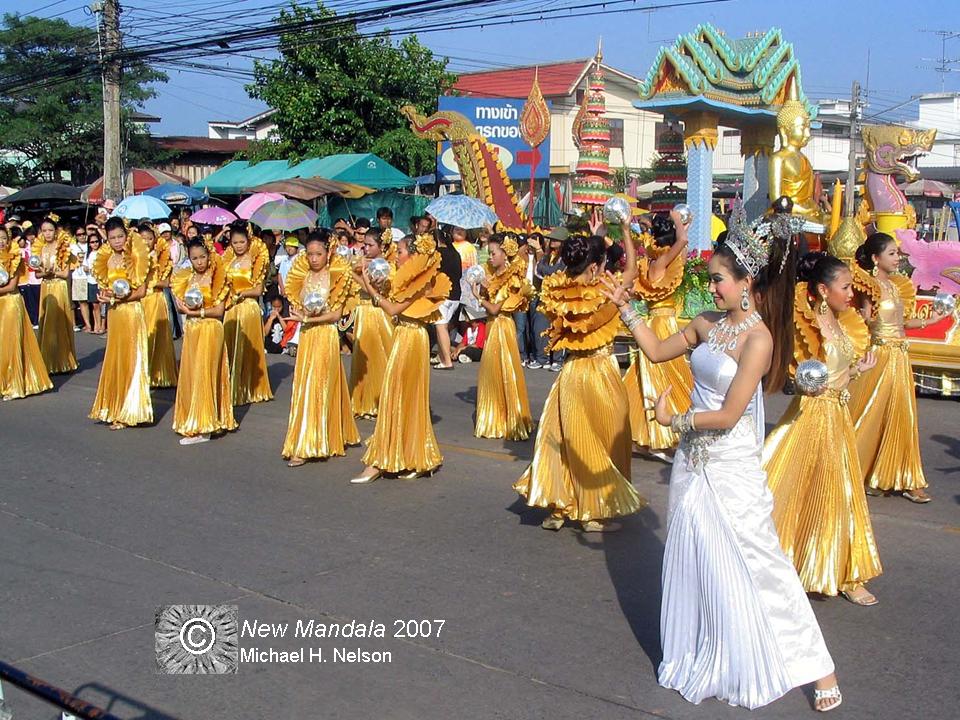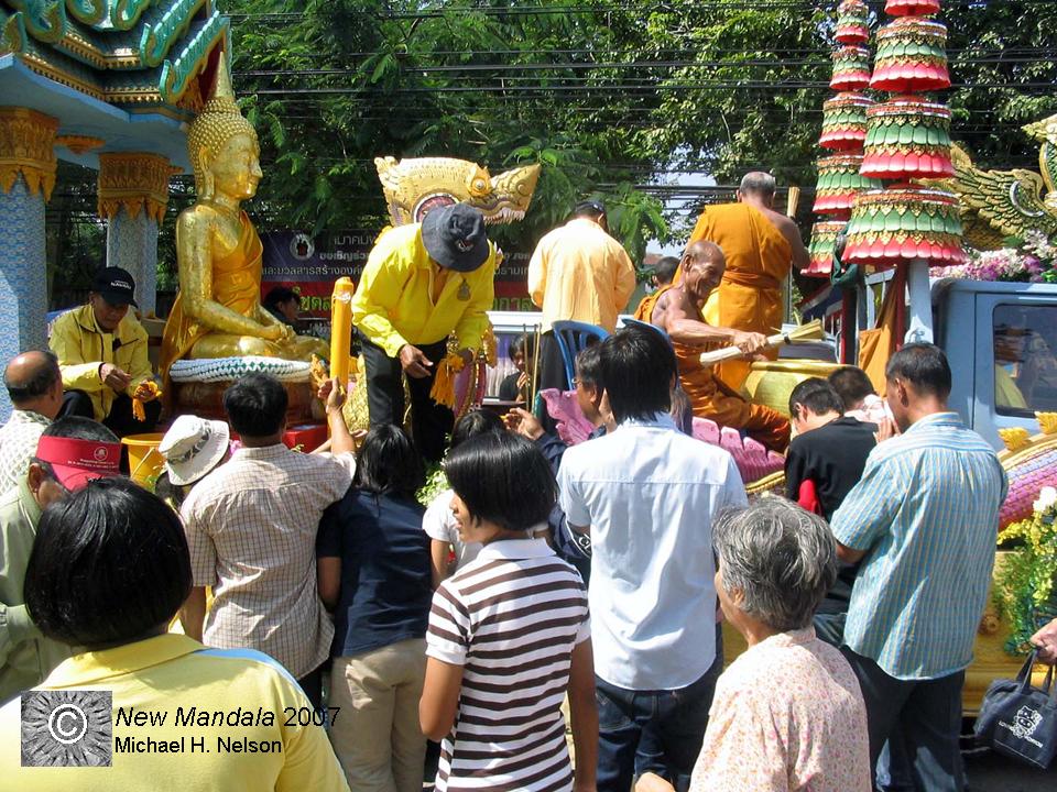In the parade procession, there was a car of particular religious-animistic importance (picture 11). Many people flocked to receive yellow holy threads and be sprinkled by a monk with holy water. Some even brought small buckets or bottles with them to have them filled with the holy water.