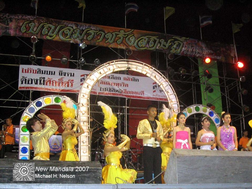 In the evening, a huge stage was erected at the same place where Chaturon Chaisaeng had made his speech. The PEC’s version was billed as a luk thung (country music) show with award-winning students from Benjamas 1 school. However, it turned out to be more like a deafening big band with girls and boys doing Las-Vegas style dancing in fancy costumes. This contrasted nicely with what one election commissioner complained about in his speech from the stage, namely the danger western influences on Thai school children posed for Thai culture. Picture 10 shows a small number of members of the troupe at the end of its rendering of the King’s official birthday song, “The father of the land.”