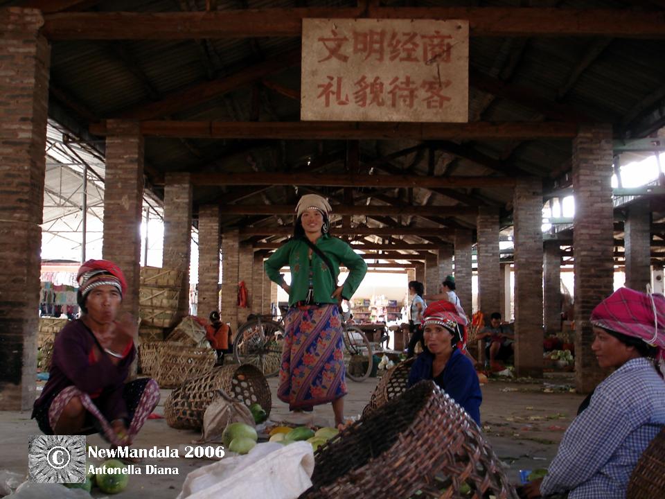 Lao Akha women from Muang Sing in north-western Laos cross the border into China on a daily basis to sell non-timber forest products at local markets and buy consumption goods to take back home. This picture, taken at the main market in Meng Man, a Chinese town near the international border with Laos, features the contradiction between state legal discourse and actual social practices. The sign in Chinese says: “conduct your business in a ‘civilised’ way and treat your customers politely”. Despite the smiling face of the woman, this is not the treatment that she usually receives in her transactions with wealthier customers and traders in China. Akha from Laos are, in fact, still discriminated as ‘savage’, ‘poor’ and ‘undisciplined’ and therefore considered by both Han and Dai people in China as not deserving respect or a ‘civilised’ treatment in business.