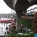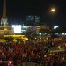 These pictures were taken from the elevated walk way over the Victory Monument between 6-8 pm last night. Around 6 pm it rained so hard most people took cover under the bridge or at the bus stops but still many of the red shirt protesters stood, sat, walked and even danced in the middle of the rain, and, apparently, some were throwing water at each other like they would in Songkran. At the Victory Monument they had four mobile speakers’ platforms – carried on top of the trucks, each of them stood at the intersections and all of them blasted at full volume at the same time so that you could hardly hear clearly what was said from each platform. But the people looked as if they didn’t care much who was doing the speaking or even if anyone was speaking at all. Many of them didn’t listen to anyone. They decided to stand in the middle of the roads and dance to their own music.