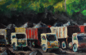 DALL·E 2023-06-14 10.29.37 – painting of coal trucks clogging a highway in sumatra