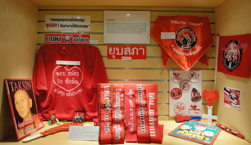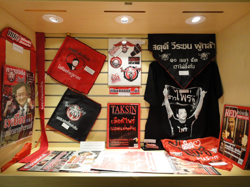 Ephemeral materials have historical and cultural value but they tend to be rare, since they are not commonly collected or preserved properly. They reflect aspects of society such as social transitions, political differences and movements, government policy, fashions, and so on. They often contain insights that traditional research publications may have overlooked. This month at the National Library of Australia’s Asian Collections we have put together a display of Colourful Thai Political Ephemera. The items in our display were collected by the National Library’s suppliers in Thailand since 2006. Here are some snapshots of the display; if you are in Canberra why not come and inspect the display, it will be up until end of October. The Thai ephemera collection is available for anybody to inspect at the Library for research or general interest.