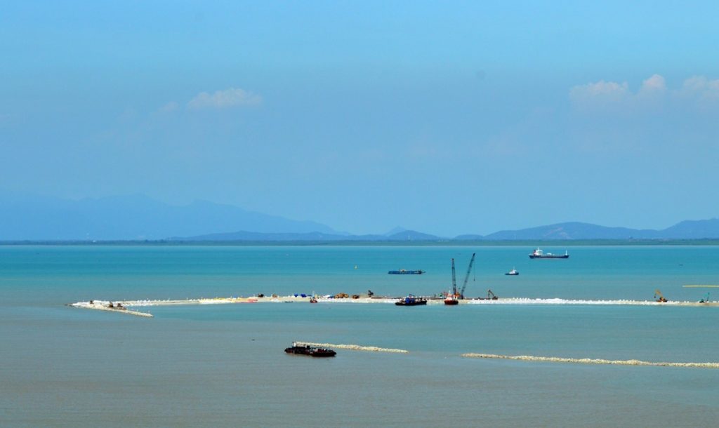 Artificial beach made for leisure space in Forest City, with on-going reclamation work and Malaysia-Singapore Second-Link shown in the backdrop (source: author).