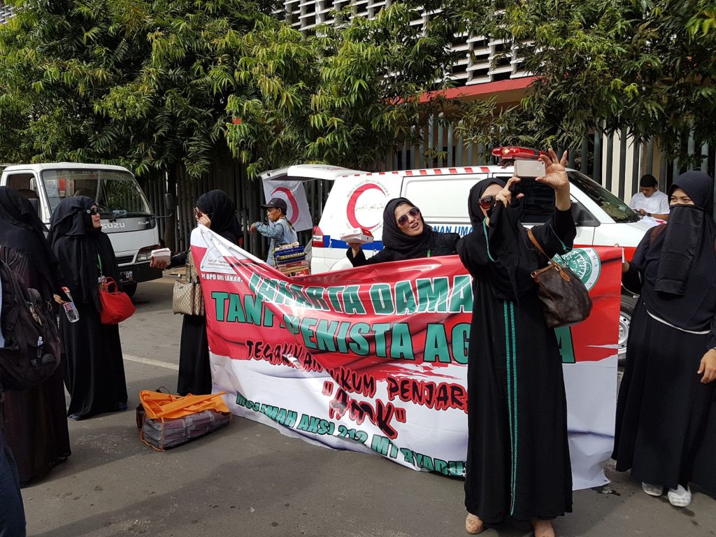 I approached another group of younger female participants from Bogor. One of them told me, “We respect Christianity and Buddhism. In return, non-Muslims should also respect our religion. But Ahok has insulted the Qur’an.” However, she confessed that she had not really studied the details of the case, “I heard about it from social media… You could check on YouTube.”