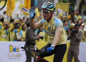 Thailand’s Crown Prince Maha Vajiralongkorn waves to crowd as he cycles in the “Bike for Dad” event in Bangkok