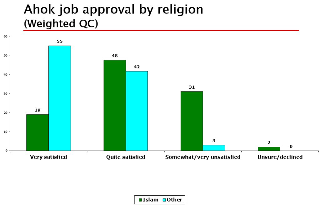 Indeed, even the Muslim electorate seemed happy with Ahok’s performance in office. Two thirds of them, the table below shows, answered ‘quite’ or ‘very’ satisfied. But Muslims made up practically all of those voters who disapproved of Ahok: he had an approval rating of 97% among Indikator’s non-Muslim respondents.