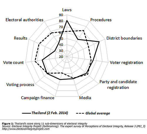 Naturally, the question must be asked whether the experts’ perceptions are also reflected in mass perceptions of electoral integrity. Furthermore, there is reason to believe that in such a deeply divided society as Thailand, popular perceptions of election quality are more colored by partisanship than elsewhere. Future research by the author based on the Asian Barometer and the World Values Survey will address these questions and also assess the impact of media consumption on public perceptions of election quality.