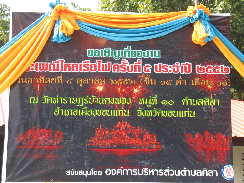 Bun Auk Phan Saa, the end of the Buddhist Rains Retreat, is usually accompanied by floating of krathong, formerly banana leaf, now usually styrofoam, individual offerings in a pond or stream. On Monday night, 5 October, one day after Phan Saa, in Baan Dong Phong, near Khon Kaen City, a traditional, larger, temporary raft, rua pae, which includes offerings, such as husked rice, salt, fermented fish, goodies, etc., in other words, things to eat for the spirits of deceased in the water which come from the assembled village households, was allowed to float down the Phong River. This offering took place a day later than it should because on Sunday night the village held a major festival, the only one in Amphur Muang, to parade rua fay, fire boats, down river for competition.