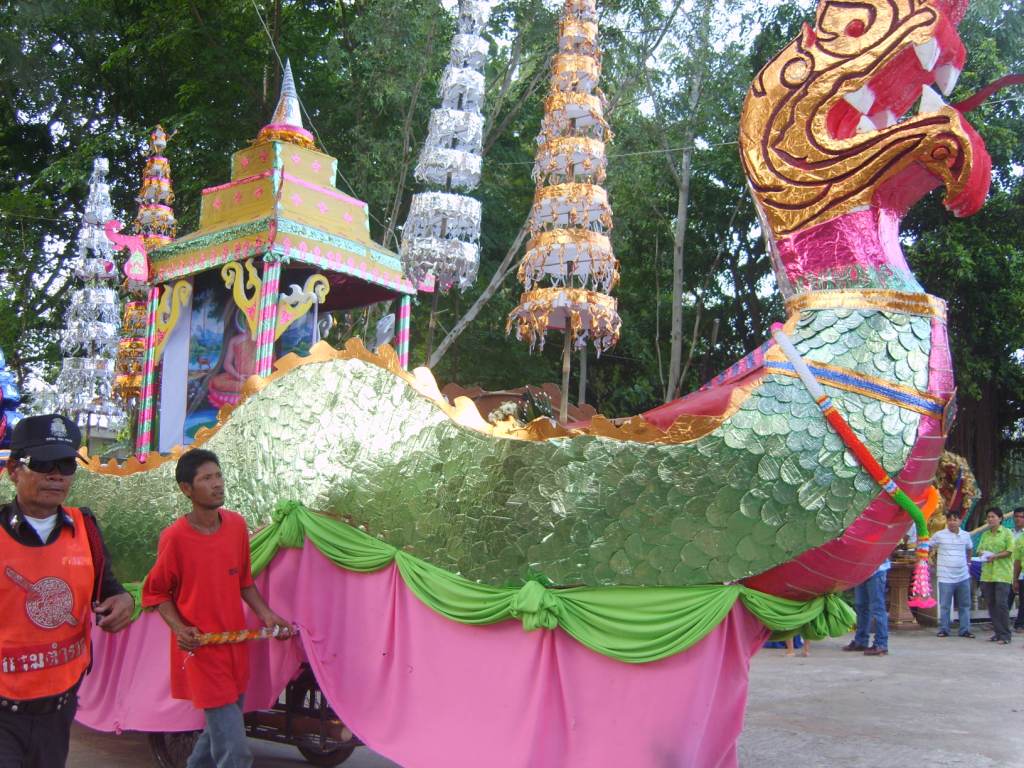 Several days prior to the event, a truck with sound system and two of these sign boards drove around Khon Kaen City and neighboring villages, announcing it and encouraging people to attend. In addition to the rua fay, the wat held a temple festival, mahorasop, including Thai boxing, films, soi daaw (which only made a profit of 2000 baat since many items had to be purchased), games for children, and much to buy. In the afternoon before the rua fay competition, a parade was held from the village’s outskirts to the wat. Leading the parade were the Tambon President and his wife riding in the back of a pick-up truck, followed by each village’s representatives walking. Then came a pushed float on which a phayanaak boat carrying a picture of The Buddha was erected, rows of dancing village women and students, who had been practicing coordinated movements for several days, followed by the village khlaung yao, semi-professional music ensemble, and all the villagers who wanted to walk to the wat.