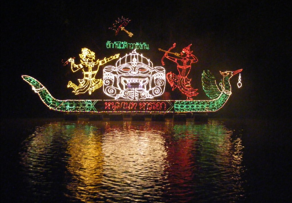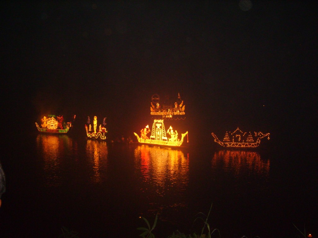 The pictures below show the four rua fay and give local explanations. All the rua fay were constructed by the men of one family — Naay In Phoothirut and his sons — some now dispersed to nearby households; metal frameworks and netting were used, with construction alongside village houses. The billboard on the river bank across from the wat was built by the wat’s monks and novices. That sign, and all of the rua fay except for the first one, were lit with electric lights powered by portable generators. As the rua fay floated slowly down river and into view from the banks of the wat, they fired fireworks; a truly impressive display of artistic and logistics skill.