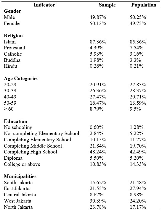 To avoid that mistake, I employed a survey experiment, which enables us to estimate the effect of Ahok’s ethnicity and religion by holding other factors constant through randomisation. The survey was conducted between the middle of November and early December. A stratified random sampling was used to obtain a sample of Jakartans aged 18 or older. A total of 1,163 Jakartans were reachable when they were first contacted by the interviewers. I dropped non-Muslim respondents and analysed only 1,016 who were Muslim.