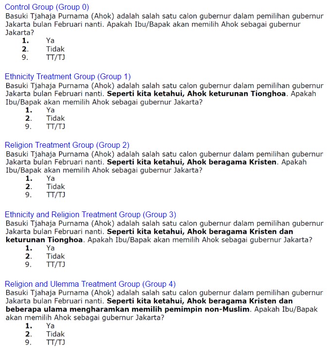 I randomly assigned respondents into groups, with each group presented with a different wording of the question. The Control Group serves as a baseline. How much do voters support Ahok if they are not reminded about his religion and ethnicity? The Ethnicity Group reminds respondents that Ahok is a Chinese descent. The Religion Group reminds respondents that Ahok is a Christian. The Ethnicity and Religion Group reminds respondents that Ahok is a Chinese descent and a Christian. Lastly, the Religion and Ulemma Group reminds respondents that Ahok is a Christian and some ulemmas forbid Muslims to vote for a non-Muslim.