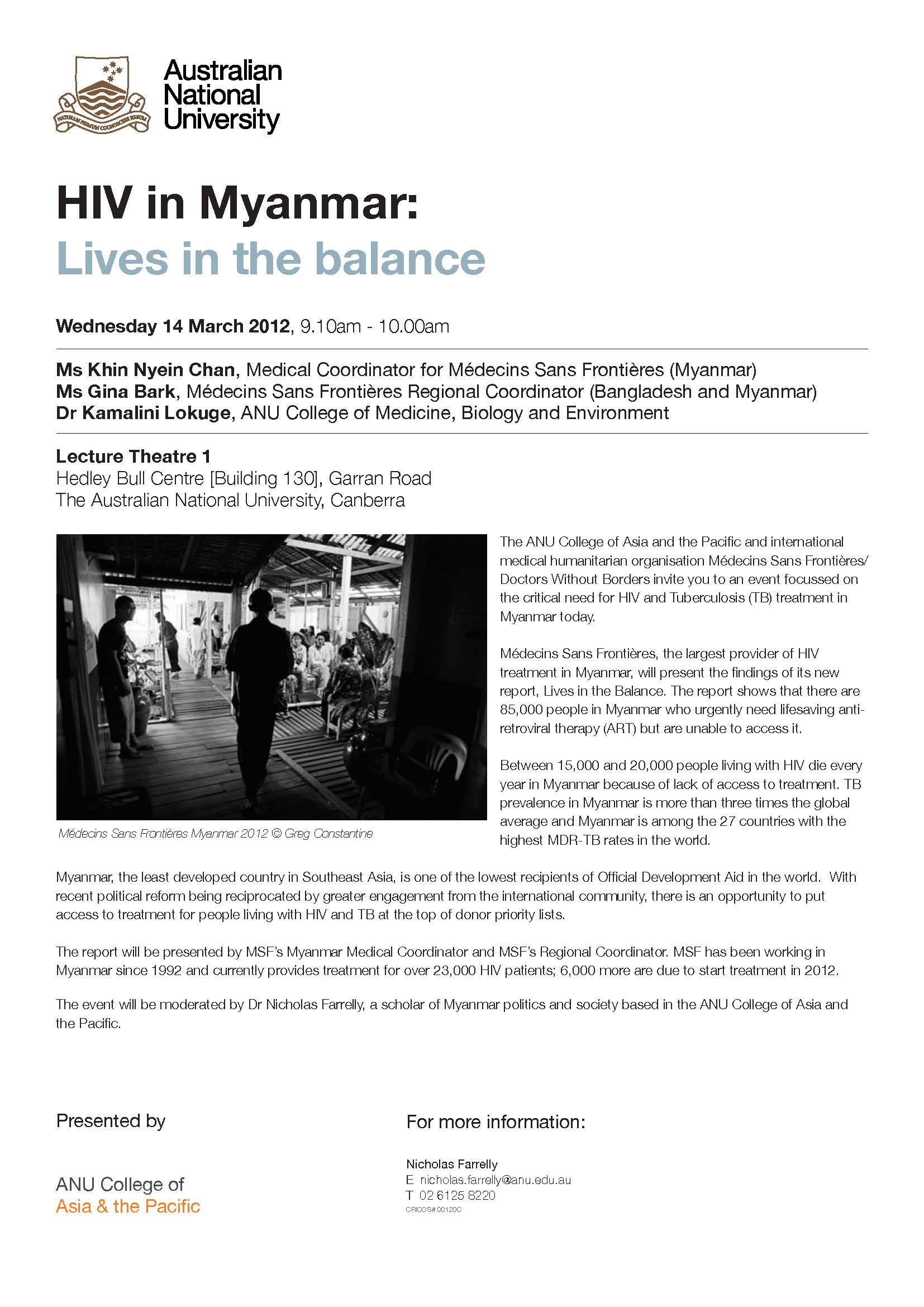 New Mandala readers in Canberra may want to come along to a special event next week which will focus on HIV in Myanmar. Three senior researchers and practitioners who deal with health issues in the country will be speaking about their ongoing work and the relevant policy questions.